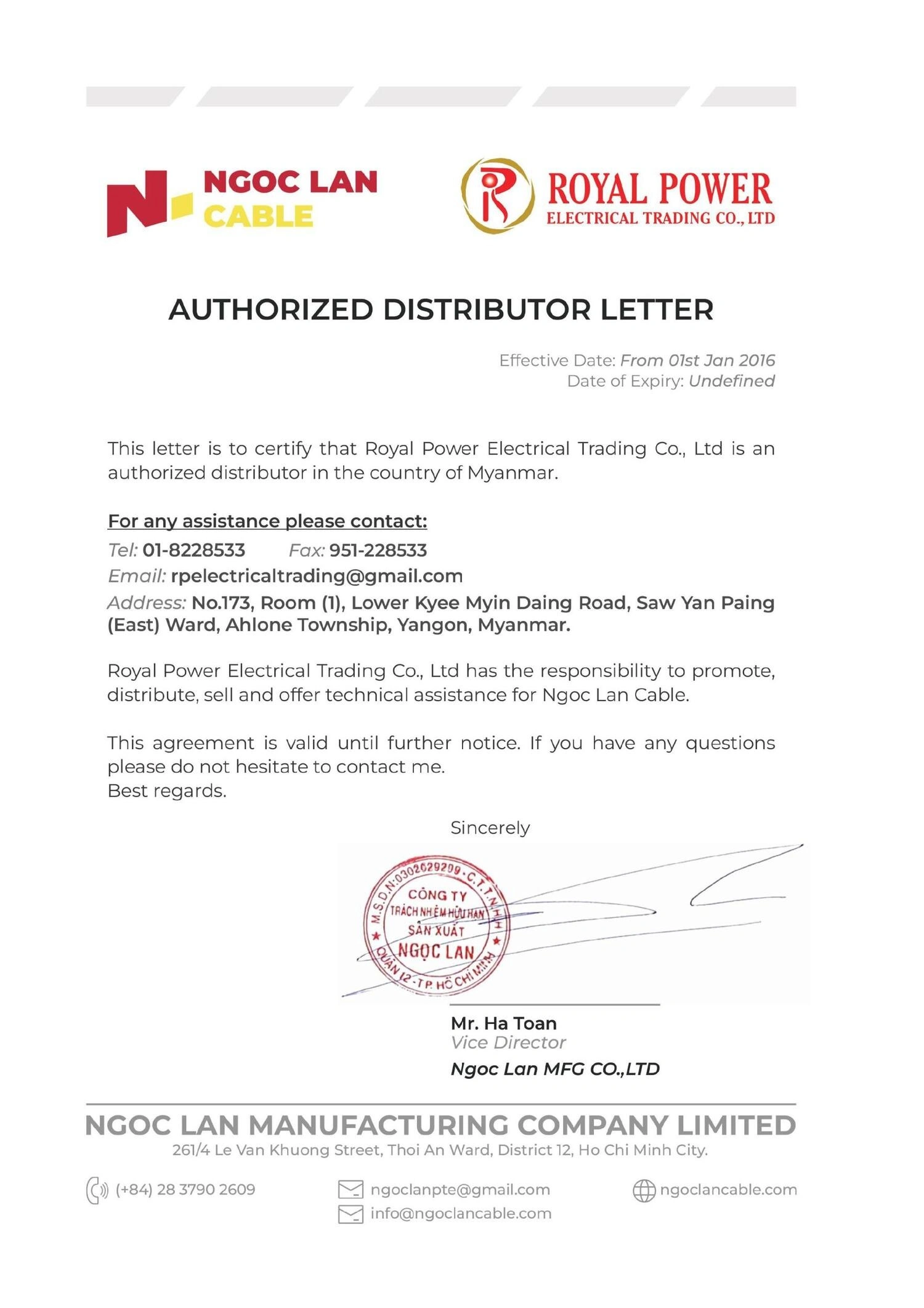 NGOC LAN MFG CO.,LTD is pleased to introduce Royal Power Electrical Trading Co., Ltd. They are our authorized distributor for electrical wires and cables in Myanmar.